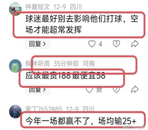 用“全华班”去打别人4节7人次外援球队,票价还不愿意“跳水”,球迷们也是怨声载道,纷纷吐槽道“免费请我看都不看,让这些人自娱自乐吧”;“球迷最好别去影响他们打球,空场才能超常发挥”;“应该最贵188 最便宜58”;“今年一场都赢不了,场均输25+”;“免费都不得去,没有意思”……