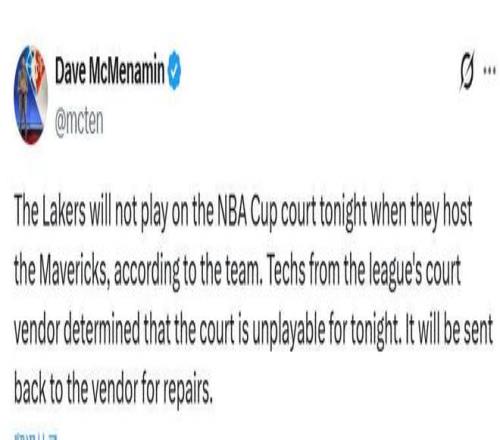 另外,湖人官方宣布,由于球队NBA杯特制地板出现质量问题,今日主场对阵独行侠的NBA杯将用常规的地板来进行比赛。据悉,联赛地板供应商的技术人员确定,今晚的比赛地板无法使用,地板将被送回供应商进行维修。