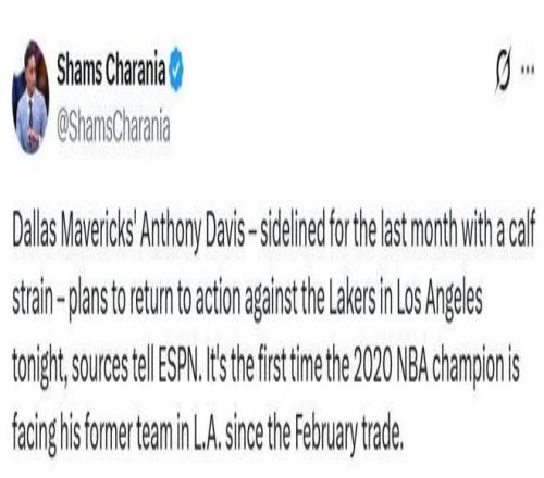 浓眉自10月30日起便一直缺阵,最初他将复出日期定在11月9日客场对阵华盛顿奇才队的比赛。然而,独行侠队老板杜蒙特搁置了这一计划——他听从了达拉斯队健康与表现主管比尔兹伯勒的建议,坚持认为除非有医疗数据表明浓眉不存在小腿拉伤加重的风险,否则不会批准其参赛。在周四的训练结束后,浓眉向记者表示,他将在独行侠队周末背靠背对阵两支洛杉矶球队(湖人与快船)的其中一场比赛中登场。