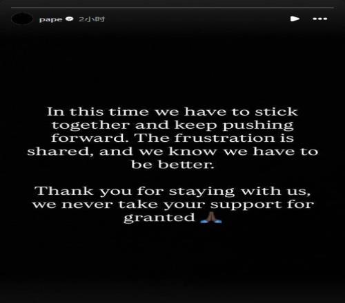 帕普-萨尔写道:“在现在这个时候,我们需要团结在一起,继续推动我们前进,我们都很沮丧,我们知道自己需要做得更好。感谢你们一直陪伴着我们,我们从来不认为你们的支持是理所应当的。”